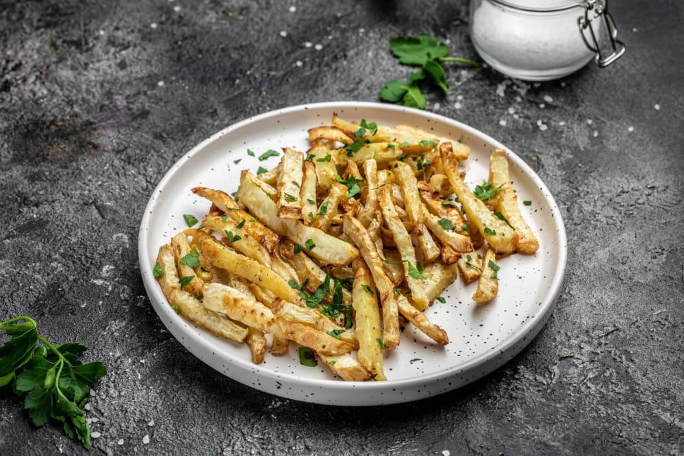 Prepare crunchy chips by chopping peeled parsnips into sticks, tossing with olive oil, salt and pepper, and baking at 200C for about 30-35 minutes.